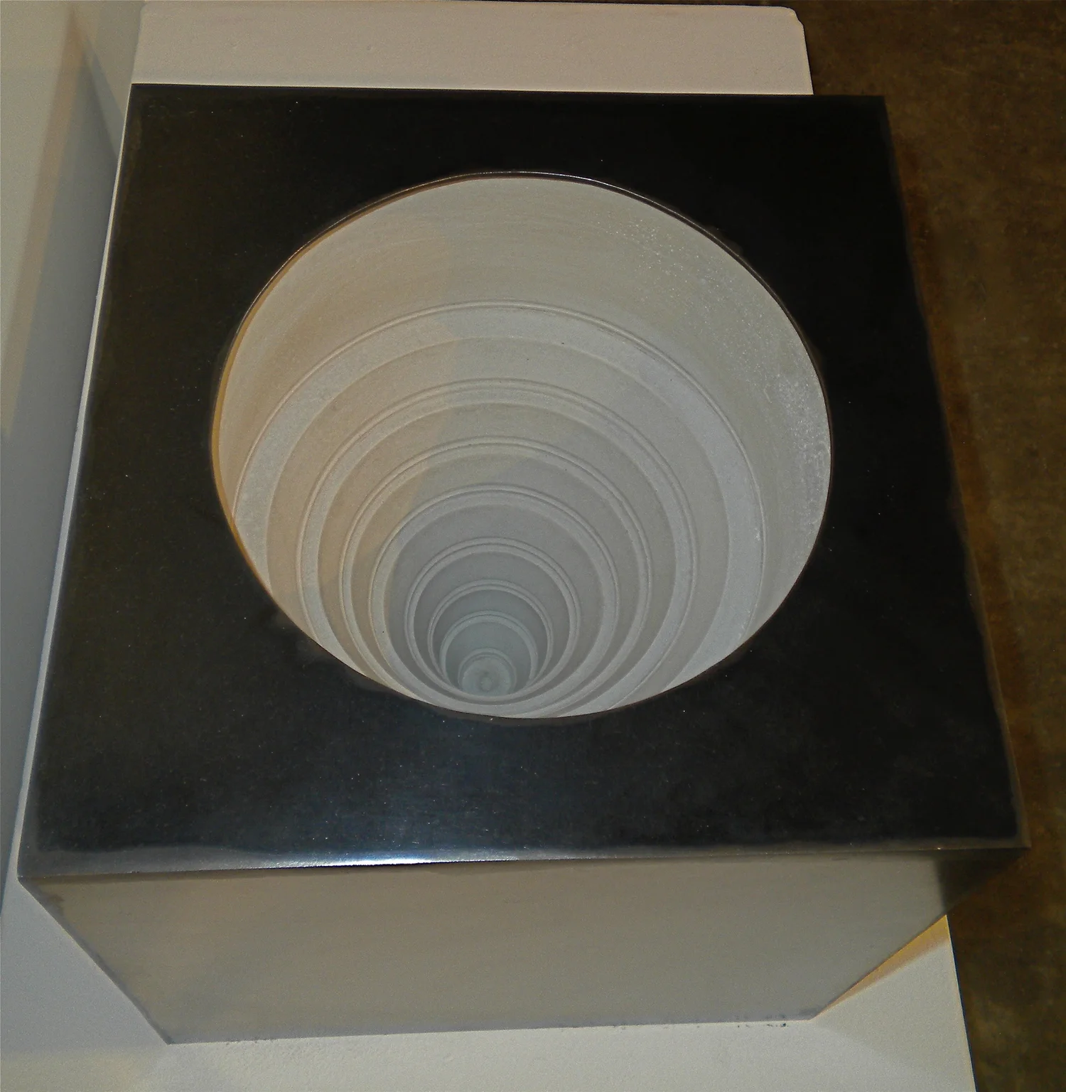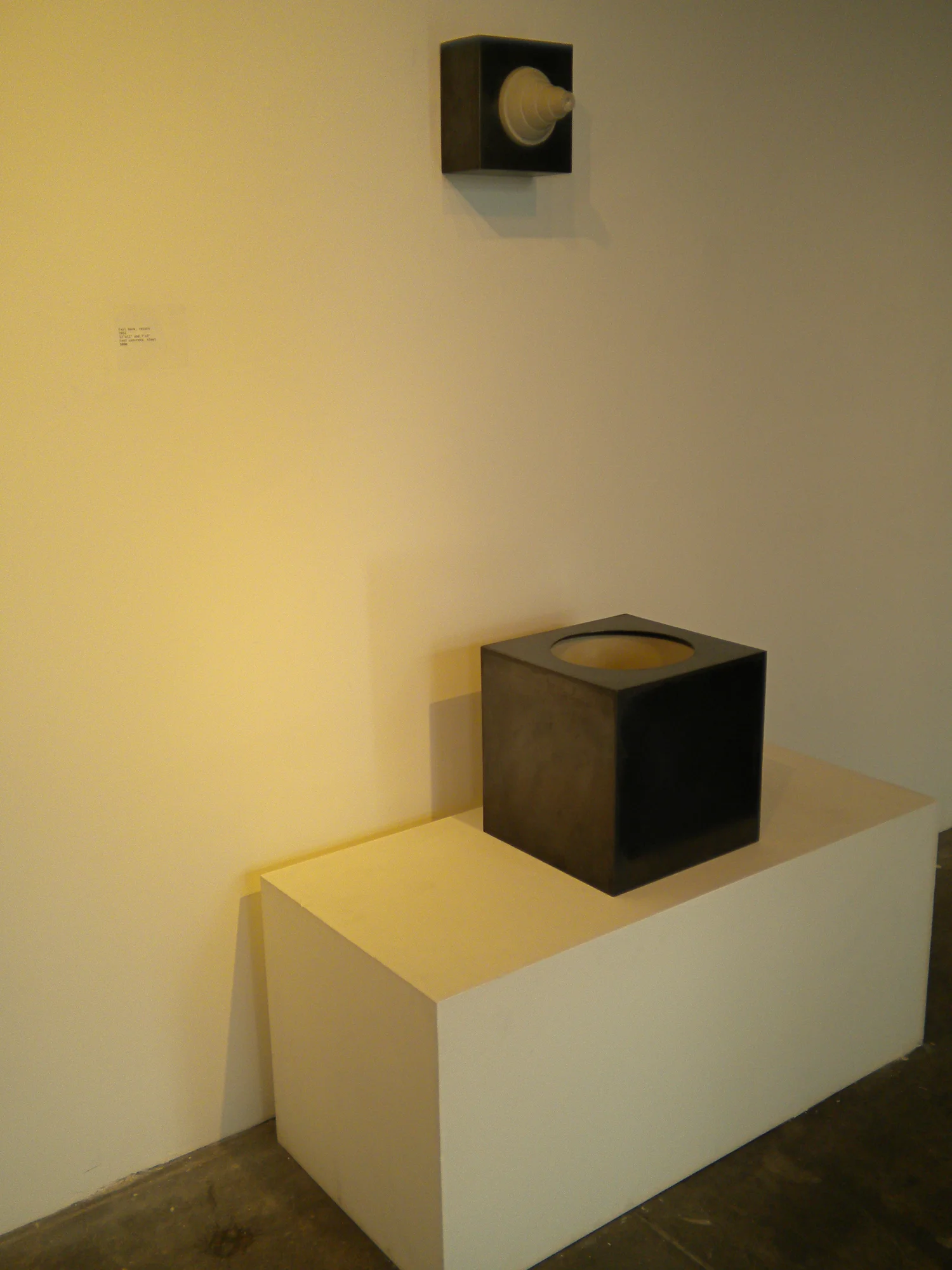 fall back, return.  Pedestal piece: 12”x 12”. Wall piece: 7”x7”. Cast concrete and fabricated steel. Both were cast from found roofing supplies.