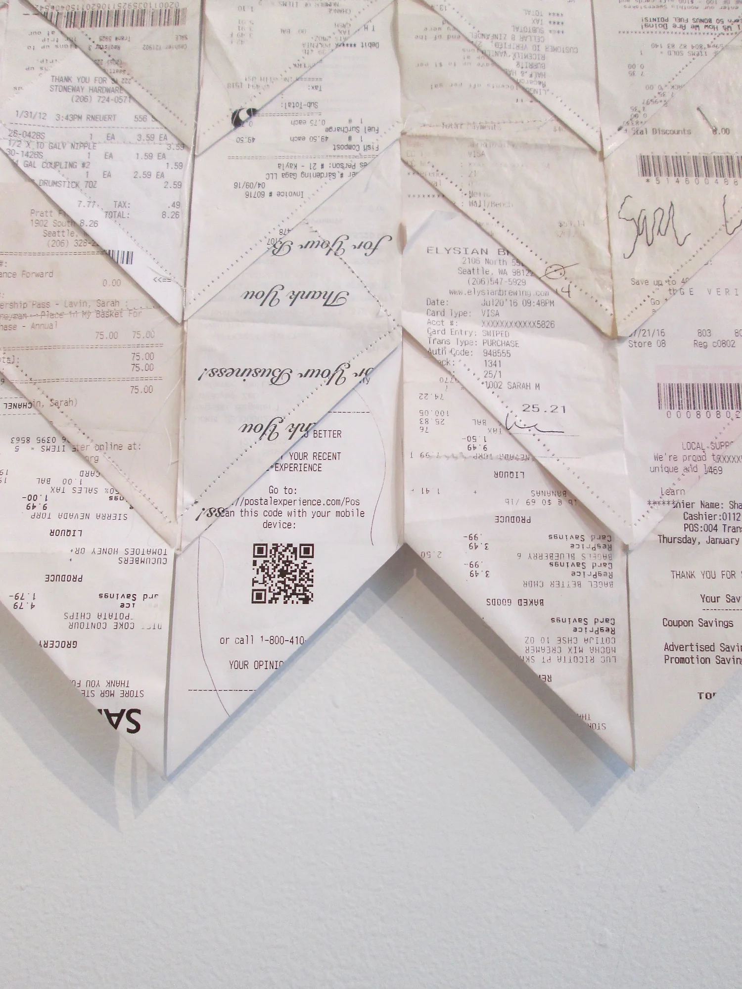 Receipt quilt.   48”x40”.  Saved, scissored and sewn receipts collected over the course of the year by artist.