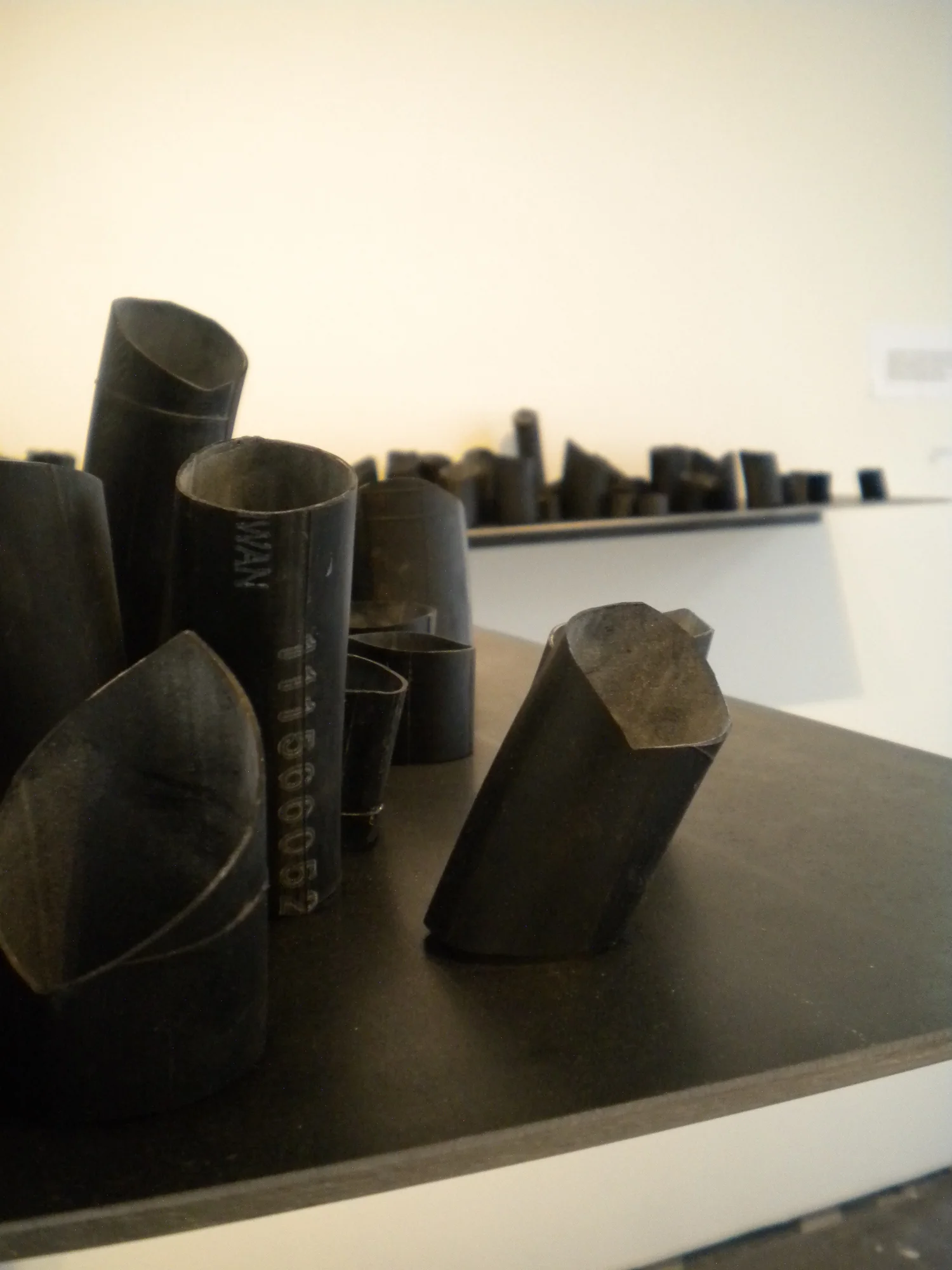 low waters.   4’x 4’x 8”.  Salvaged bike inner tubes from artist. Steel shelf.