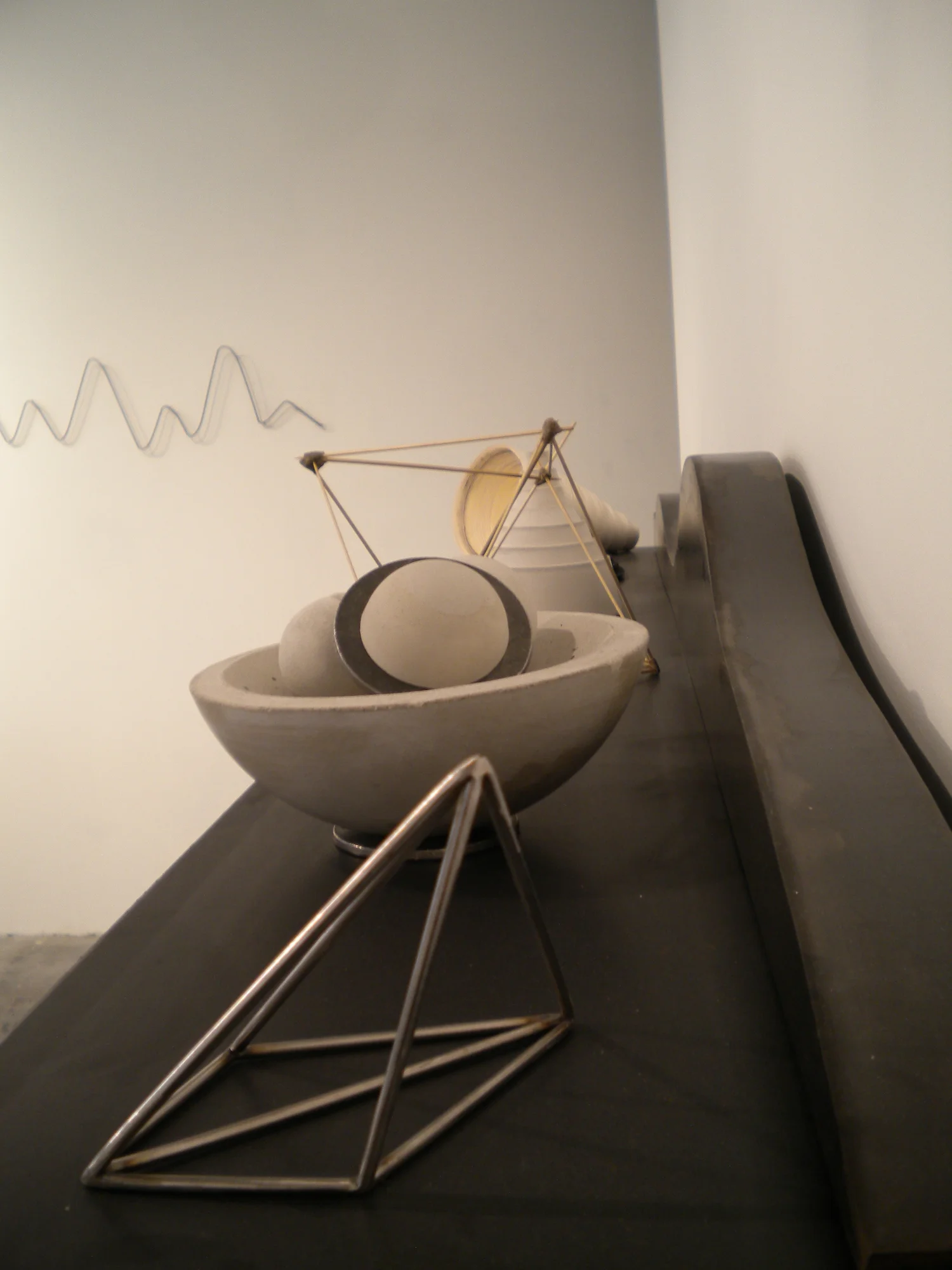 little planets.   Each 4” diameter. Steel and cast concrete.