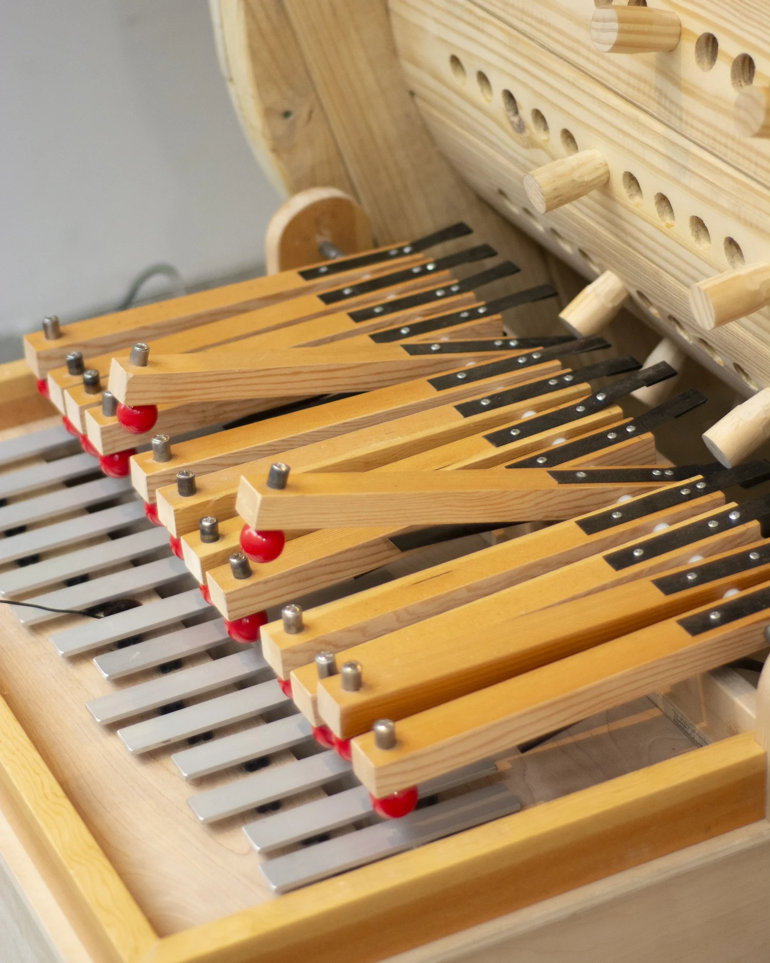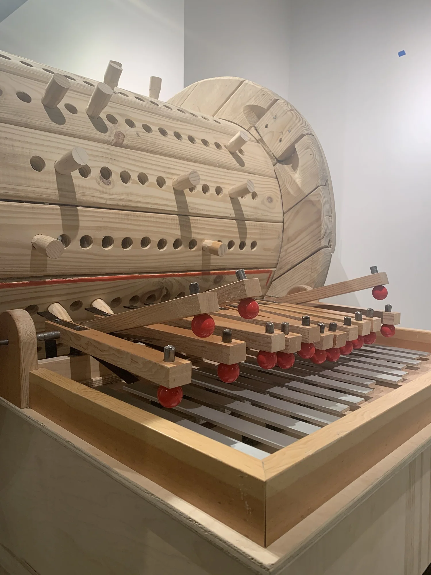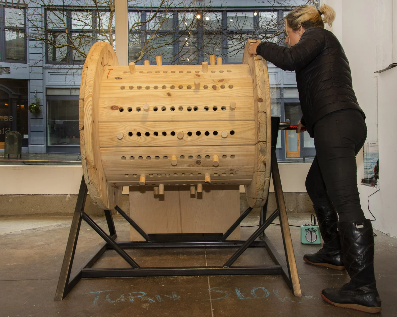 Glockenspiel. (Big Ass Music Box)  Dimensions variable. Aluminum bars, wood spool, wood arms with resin heads, wood pegs and wood resonating box.  Place pegs in the holes in the drum.  Spin the spool clockwise SLOWLY.