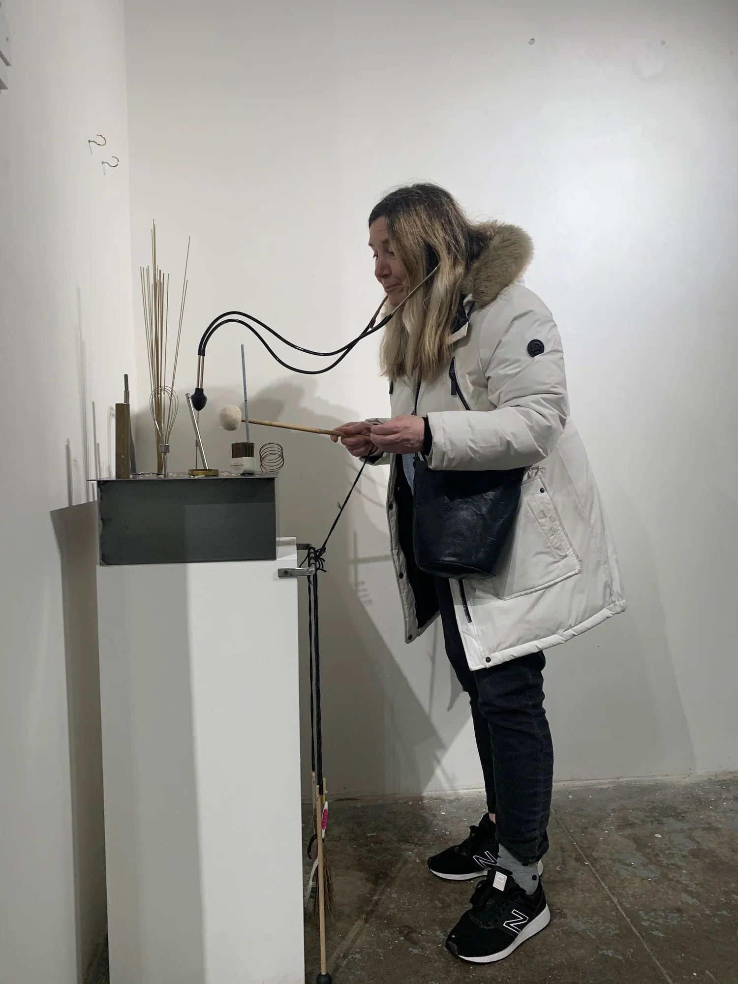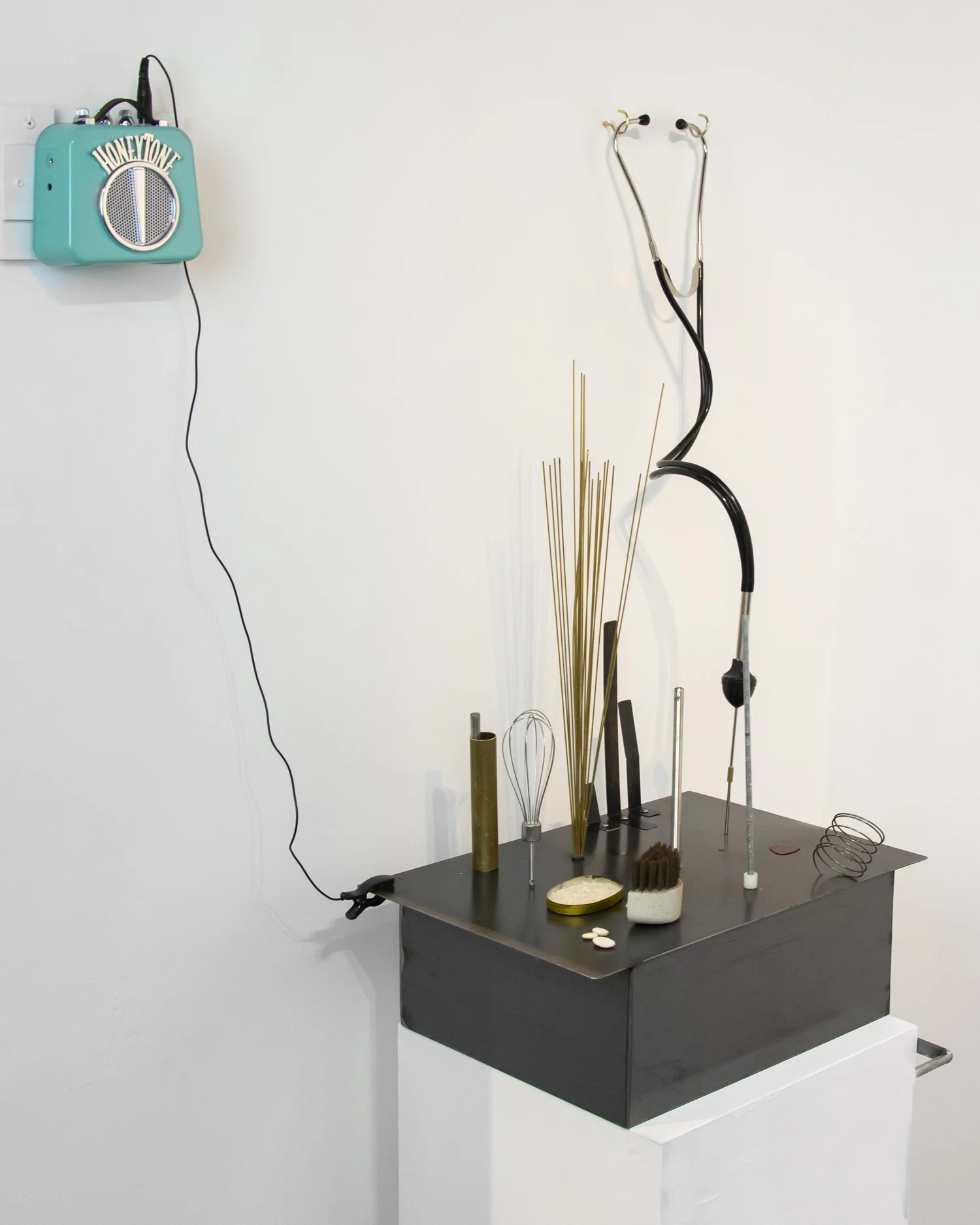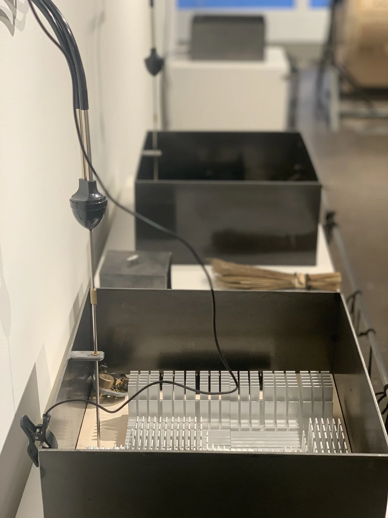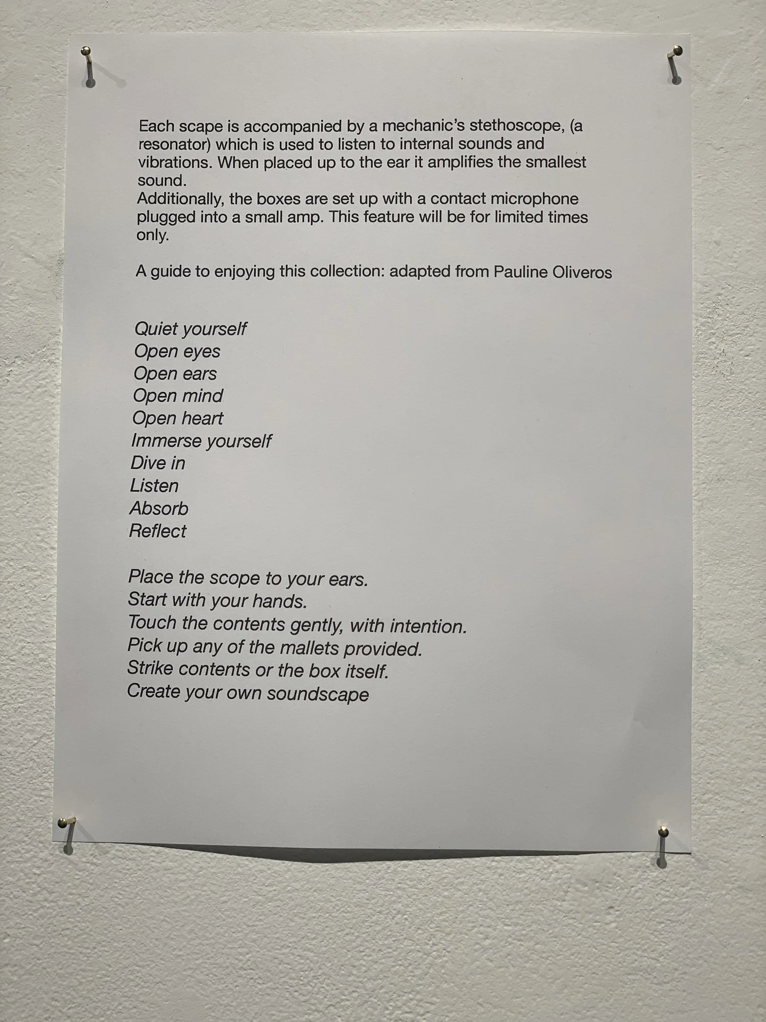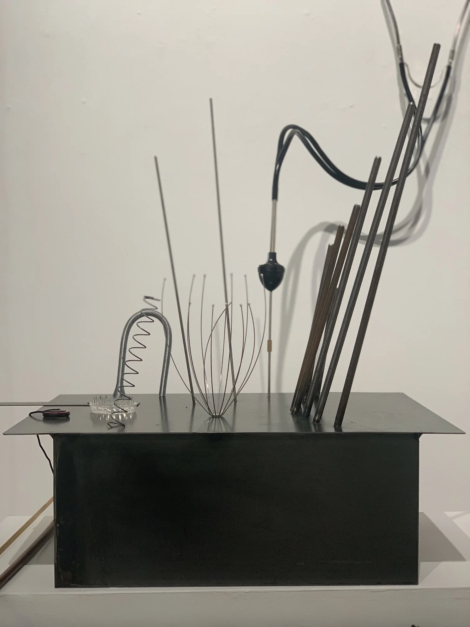 Acoustic Landscapes . Steel resonators. 14"x 12"  Box 1. Brass welding rod and tubing, steel brush and banding, whisk, springs and threaded rod.  Box 2. Steel rods, bandsaw blades, springs and scalp massager. .Each field is accompanied by a mechani