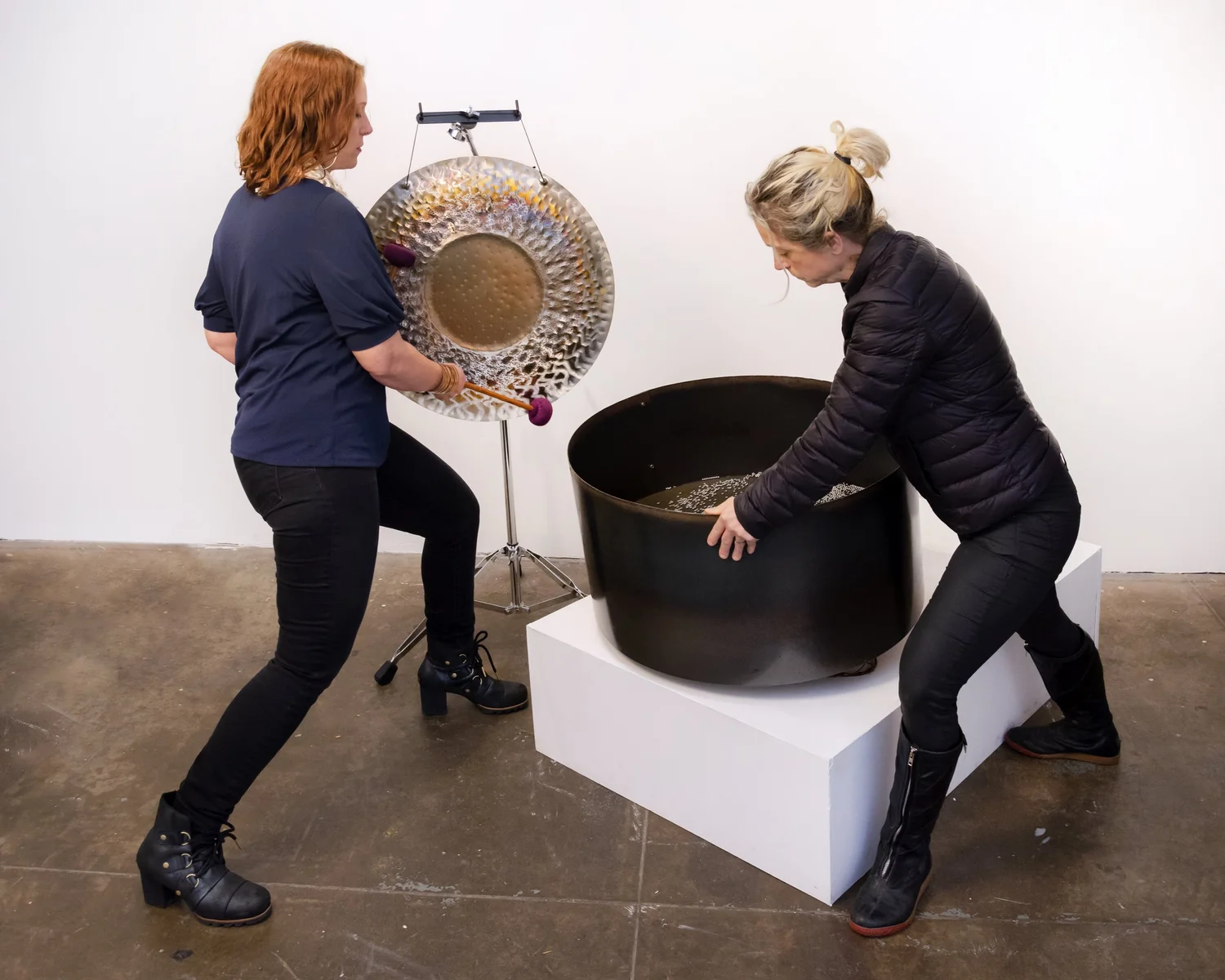 Ocean Drum .  34" Diameter. Steel, wood, ball bearings and coils from a box spring.  Hold the edges of the drum with both hands and tilt back and forth slowly so the BBS roll across the bottom of the drum. Enjoy the sound of the crashing and cresti